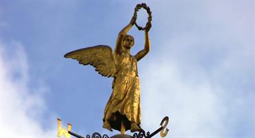 Sculptor: G T Robinson. This life size gilded copper angel holding a laurel wreath stands on top of the old Town Hall in Burslem. The angel was immortalised by Arnold Bennett in his books ‘Clayhanger’ and ‘The Old Wives Tale’ where Burslem is thinly disguised as Bursley. The Angel is also rumoured to have been the inspiration for Robbie Williams’ hit song, Angels, in 1997.