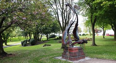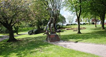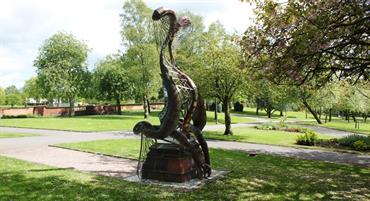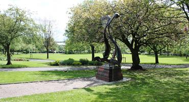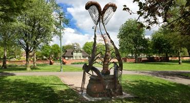 Sculptor: Andy Edwards, Phil Hardaker. Artwork from pupils at: Jackfield Infant School, Moorpark Junior School and Haywood High School A steel sculpture inspired by the lifecycle of the Mayfly located in the beautiful surroundings of Burslem Park. It replaces a statue of a small boy that was vandalized in the 1960s and sits on the original plinth which features ceramic details by pupils from three local schools.