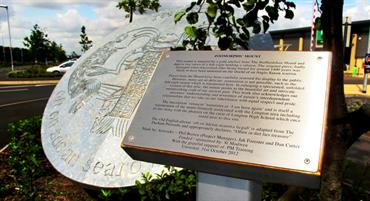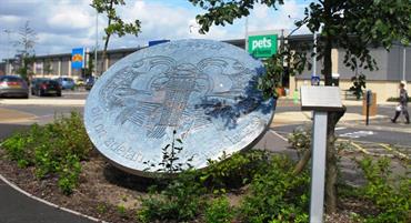 Made by: Artworks: Phil Brown (Project Manager), Jak Forester and Dan Cutter. This mount is inspired by a gold artefact from The Staffordshire Hoard and depicts two views of a fish eagle holding a salmon. The original piece, badly damaged when discovered after being buried for around 1400 years was likely to have been mounted on the shield of an Anglo-Saxon warrior. Location Phoenix Retail Park, Longton.